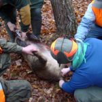 Czwarty miot – przy leśniczówce – są dwie watahy dzików. Jedna z nich uchodzi do tyłu, gdzie jako ostatni stoi Kol. Jarek. No i nie ma wyjścia – popisuje się pięknym dubletem do dwóch warchlaków. Strzałów było więcej, ale król pudlarzy też jest potrzebny na polowaniu.